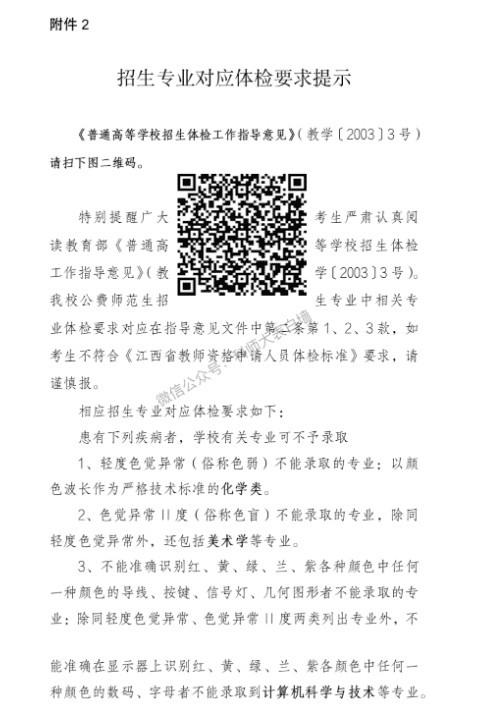 特别提醒:考生因体检状况不符合要求,可能在录取时出现调剂甚至退档的情况;在教学培养过程和毕业就业时出现不能认定教师资格情况。请注意参照上述体检文件回避填报身体条件不符不宜的专业,例如:轻度色觉异常(俗称色弱)不能录取的专业有化学、生物科学等;色觉异常II度(俗称色盲)不能录取的专业有美术学、工艺美术等;不能准确在显示器上识别红、黄、绿、兰、紫各颜色中任何一种颜色的数码、字母者不能录取的专业有计算机科学与技术等。